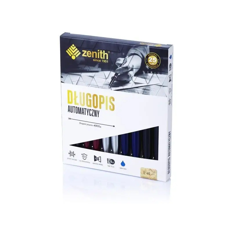 Długopis wyposażony jest w sprężynowy system wysuwania wkładu, co zapewnia wygodę użytkowania. Dodatkowo, wykorzystuje wkład wielkopojemnościowy Zenith 4 z dokumentalnym tuszem w kolorze niebieskim, gwarantującym najwyższą jakość pisania. Idealny zarówno do codziennych notatek, jak i bardziej formalnych okazji, długopis Zenith 60 z pewnością stanie się niezastąpionym narzędziem w Twoim biurze lub na uczelni. Wybierz długopis, który łączy styl z funkcjonalnością.