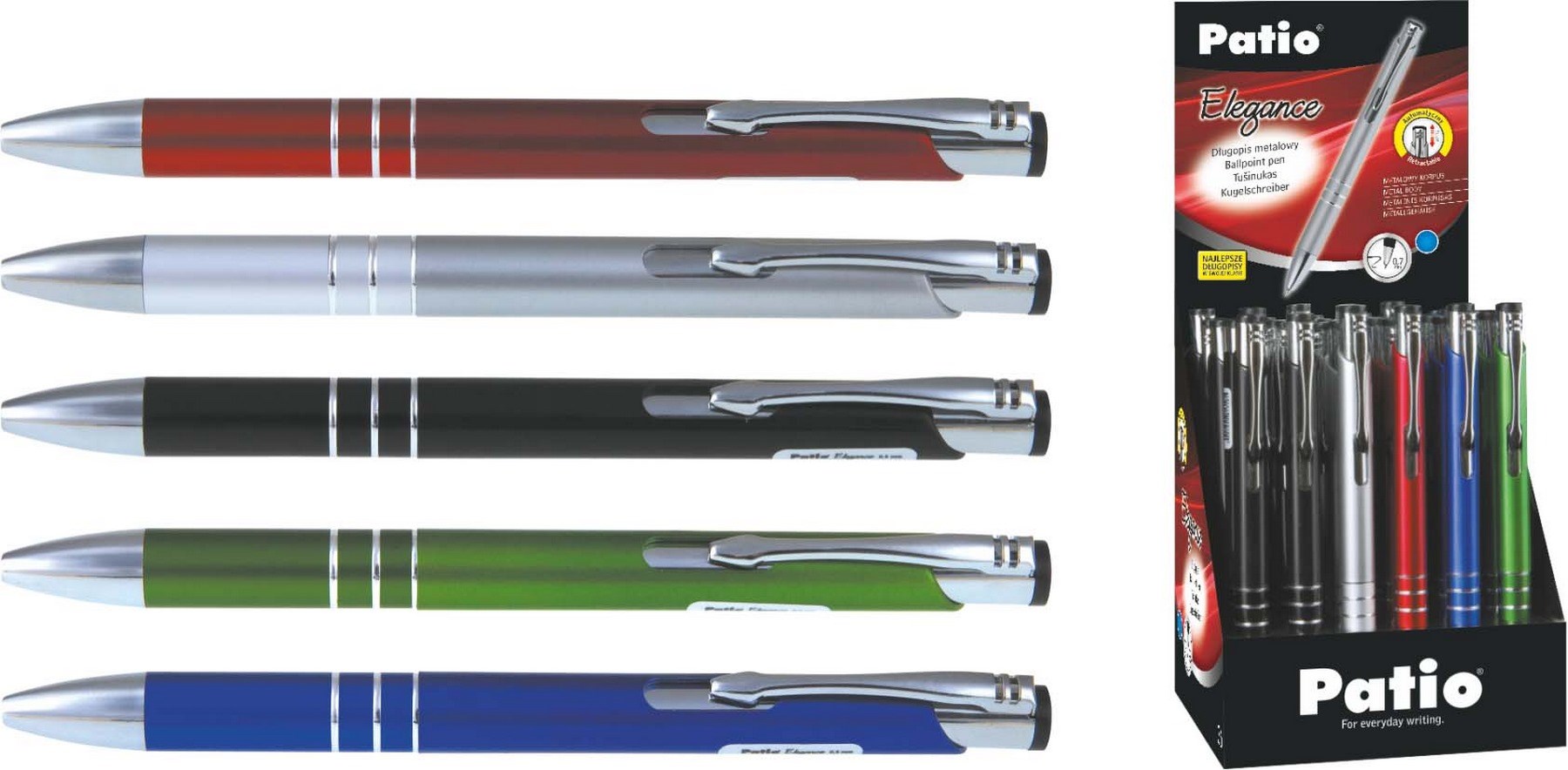 Długopis Patio Elegance Długopis Elegance z metalową obudową. Kolor wkładu - niebieski. Grubość linii pisania: 0,7mm. Wkład wysuwany za pomocą przycisku. Dostępne są różne kolory obudowy długopisu - wysyłane losowo Cena za sztukę. EAN: 5907690813581