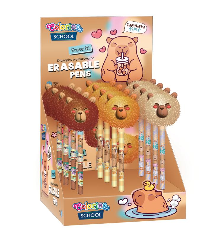Długopis wymazywalny Colorino z ozdobnym pomponem w motywie kapibary łączy estetykę z funkcjonalnością, idealny do szkoły, biura i codziennych notatek. Gumka do wymazywania pozwala szybko poprawić tekst bez użycia korektora, a wygodny korpus zapewnia komfort pisania przez dłuższy czas.