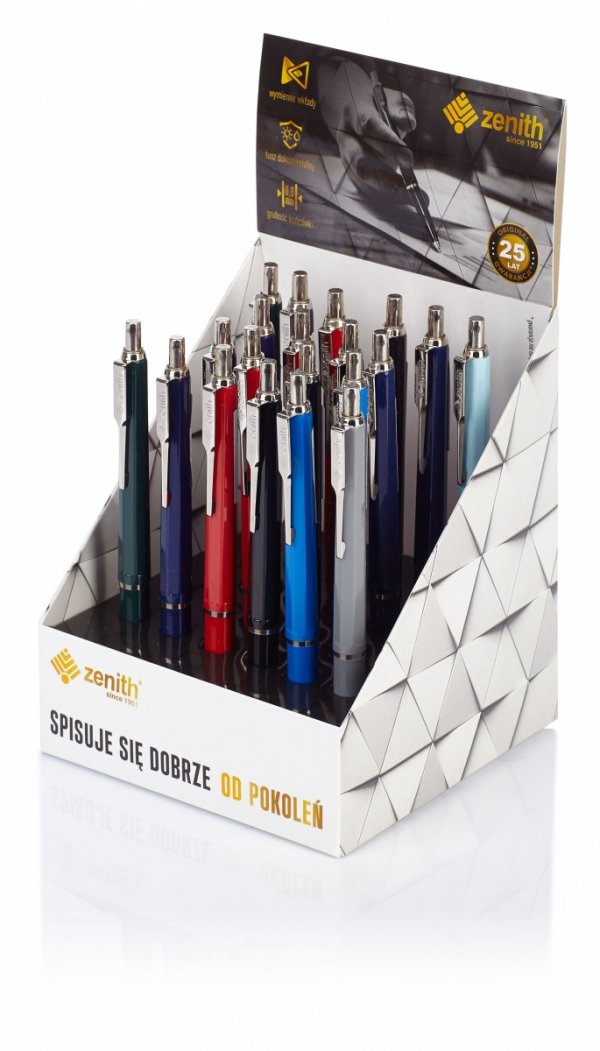 DŁUGOPIS ZENITH długopis automatyczny tradycyjnej polskiej marki korpus długopisu wykonany z lśniącego tworzywa sztucznego obudowa dzielona w 1/3 wysokości (górna część ośmiokątna) obie części korpusu oddzielone mosiężno-niklowaną obrączką metalowe elementy dolnej części korpusu trwale związane z elementami plastikowymi wymienny wkład wielkopojemny Zenith 4 z dokumentalnym tuszem w kolorze niebieskim, gwarantującym długą trwałość zapisu długość okresu przechowywania: minimum 5 lat mix kolorów obudowy - wysyłamy losowo Cena za sztukę. EAN: 5906340672400