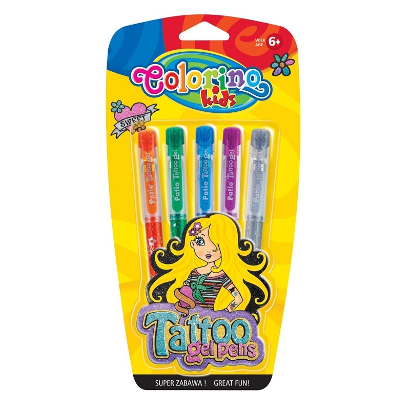 Zestaw 5 brokatowych długopisów żelowych marki Colorino - idealne do wykonywania tatuaży na skórze. Pozostawiają cienki, wspaniale mieniący się ślad. W zestawie szablony. Miękko piszą, nie wysychają ani nie wylewają się. Zmywają się za pomocą wody i mydła. EAN: 5907620115860