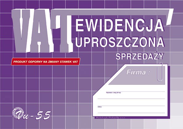 DRUK EWIDENCJA UPROSZCZONA SPRZEDAŻY VAT A5 VU-55 Wykonany został z papieru offsetowego Druk jest dwustronny Znajduje zastosowanie jako uniwersalne uproszczone zestawienie sprzedaży dla podatników objętych ustawą o podatku od towarów i usług Produkt zawiera 32 strony w albumie W poręcznym formacie A5 (w orientacji poziomej) Cena za album 32 strony EAN: 5906858011388