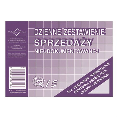 DRUK K15 DZIENNE ZESTAWIENIE SPRZEDAŻY NIEUDOKUMENT format: A6 rodzaj papieru: offsetowy zastosowanie: podatnicy prowadzący księgę przychodów i rozchodów oprawa: bloczek 50 kartek druk: dwustronny Cena za bloczek 50 kartek EAN: 5906858001136