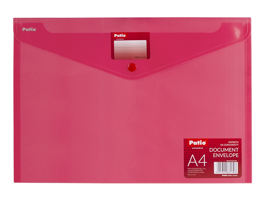 Przezroczysta, wyposażona w trwały zatrzask, wcięcie ułatwiające umieszczanie lub sięganie po dokumenty, rozmiar: 330 x 235 mm, zgrzewana po bokach.