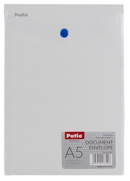 KOPERTA NA DOKUMENTY A5 PATIO PAT3164/13 BEZBARWNA Teczka kopertowa pionowa Format: A5 Zamykana na zatrzask Cena za 1 sztukę. EAN:5907620173228