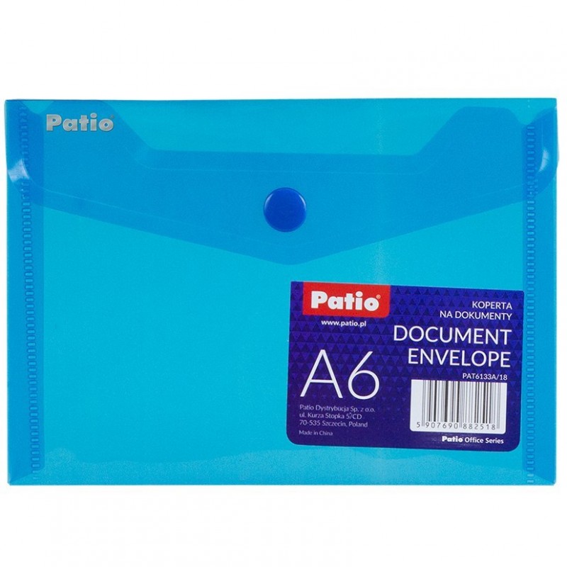 KOPERTA NA DOKUMENTY A6 PATIO PAT6133A/18 NIEBIESKA Teczka z kolorowego, przezroczystego tworzywa polipropylenowego. Idealna do przechowywania, przenoszenia i przesyłania dokumentów, co ułatwi funkcjonowanie w firmie. Transparentna teczka na dokumenty formatu A6. Zamykana na klips. Cena za 1 sztukę. EAN:5907690882518