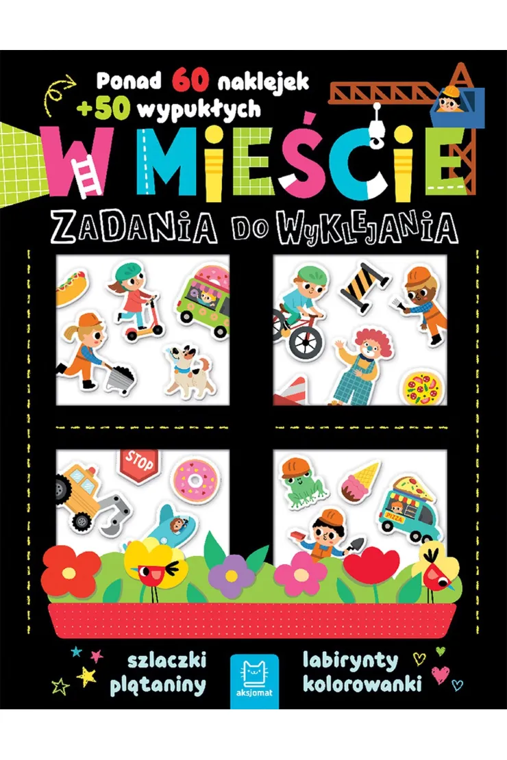 Książeczka "W mieście" — zadania do wyklejania to zestaw kreatywnych ćwiczeń dla dzieci zawierający ponad 60 naklejek oraz 50 wypukłych naklejek, które można wykorzystać do rozwiązywania labiryntów, łączenia punktów, wyszukiwanek, plątanin i kolorowanek rozwijających logiczne myślenie i wyobraźnię.