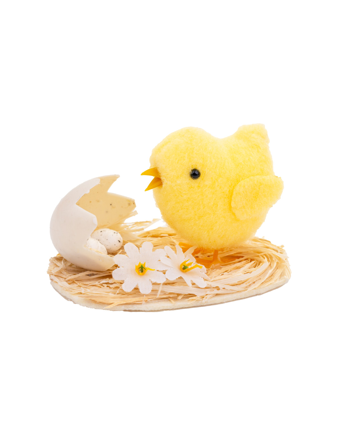 Kurczak na podstawce 7 cm w kolorze żółtym, idealny jako ozdoba wielkanocna lub element dekoracji wiosennych, sprzedawany w opakowaniu zawierającym 1 sztukę.