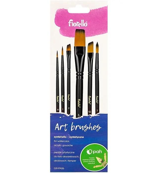 Zestaw sześciu wysokiej jakości pędzli artystycznych Fiorello to idealne narzędzie zarówno dla początkujących, jak i doświadczonych artystów. Każdy pędzel wyposażony jest w dwukolorowe, nylonowe włosie, które charakteryzuje się doskonałą elastycznością i zdolnością do chłonięcia farby, co pozwala uzyskać precyzyjne i równomierne pociągnięcia. Rączka pędzli wykonana została z wytrzymałego drewna brzozowego, a jej głęboka, matowa czerń nadaje estetyczny wygląd. Pędzle posiadają również czarną aluminiową skuwkę, co zapewnia loro trwałość i solidność. Zróżnicowane kształty i rozmiary pędzli sprawiają, że idealnie nadają się do pracy z farbami akrylowymi, akwarelowymi, gwaszem oraz temperami, co czyni je uniwersalnym narzędziem w każdej technice malarskiej. Zestaw jest zapakowany w praktyczne opakowanie blisterowe, co ułatwia przechowywanie oraz transport pędzli.