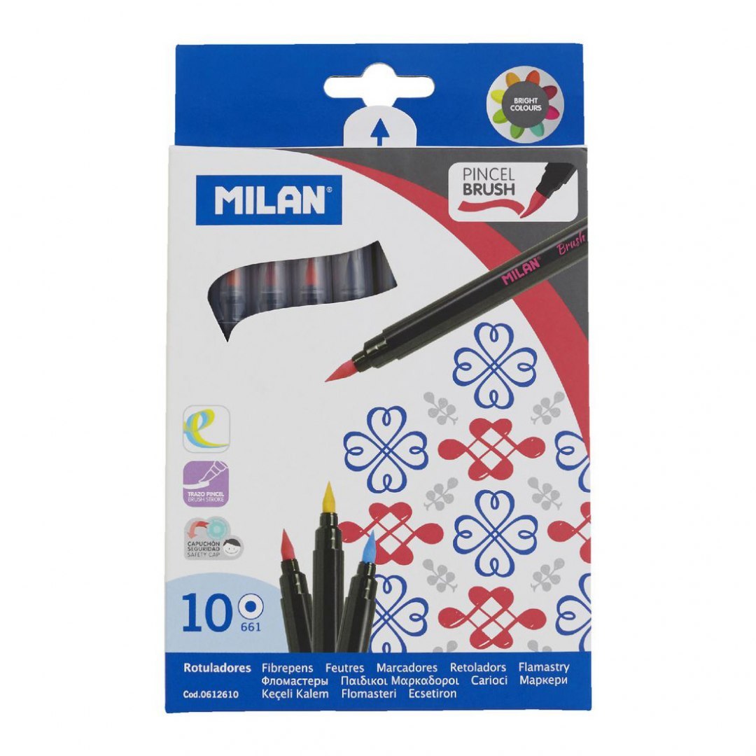 PISAKI ZE STOŻKOWĄ KOŃCÓWKĄ 10 KOLORÓW MILAN Flamastry z wytrzymałą i rozciągliwą końcówką w kształcie pędzelka. Wspaniałe do kaligrafii i malowania zróżnicowanych kresek. Pędzelkowa końcówka zezwala na rysowanie cienkich i grubych linii od 2 mm do 4 mm. W opakowaniu 10 kolorów: żółty, granatowy, niebieski, fioletowy, brązowy, pomarańczowy, czarny, czerwony, różowy, zielony. Tusz na bazie wody generuje jaskrawe i intensywne barwy, które można ze sobą mieszać. Tusz można z łatwością wyprać z większości tkanin (moczyć tkaninę w zimnej wodzie poprzez godzinę, a następnie prać w pralce w niskiej temperaturze). Bezpieczna wentylowana skuwka umożliwia oddychanie w przypadku połknięcia. Flamastry MILAN są zgodne z europejskimi i amerykańskimi normami bezpieczeństwa. Nie zawierają ftalanów, metali ciężkich i innych substancji toksycznych. Są bezpieczne dla dzieci. Wymiar flamastra: 15,8 x Ø 1,00 cm. Cena za opakowanie 10 sztuk. EAN:8411574056072