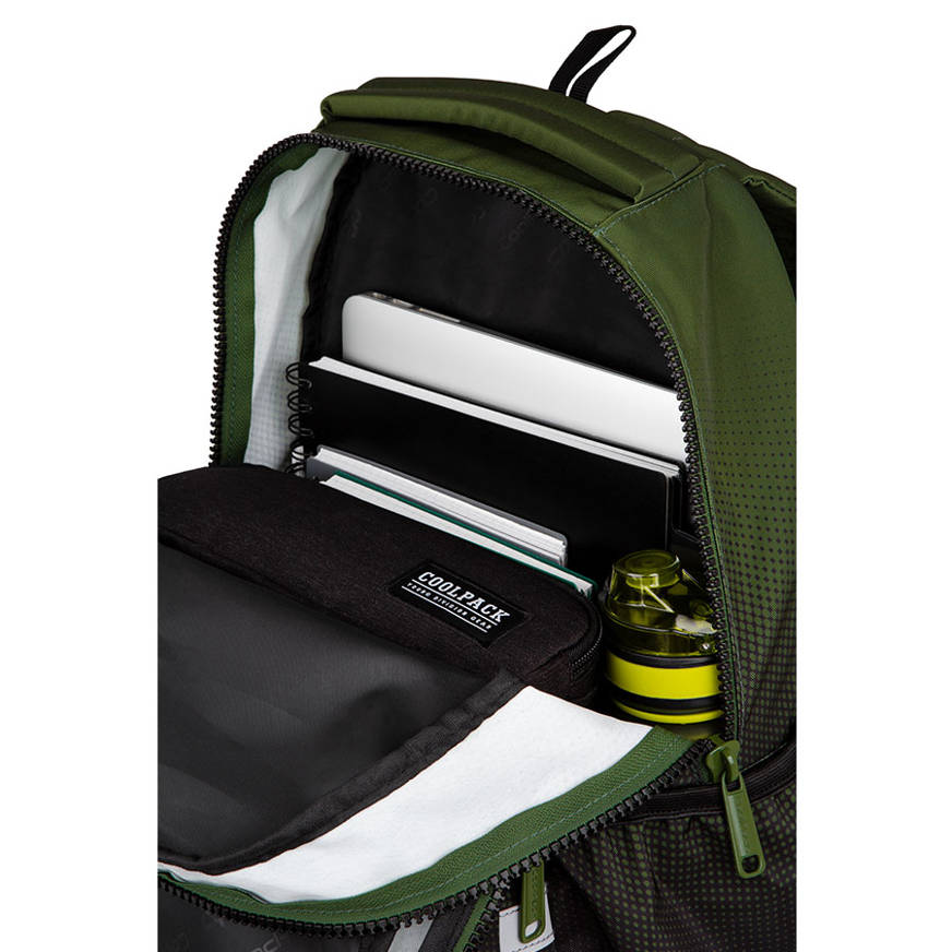 2 komory Wyprofilowane plecy Wyściełane szelki i rączka Wzmocniony spód Kieszeń z organizerem Kieszeń na laptop Boczne kieszonki na bidon Przywieszka do kluczy 600D Poliester