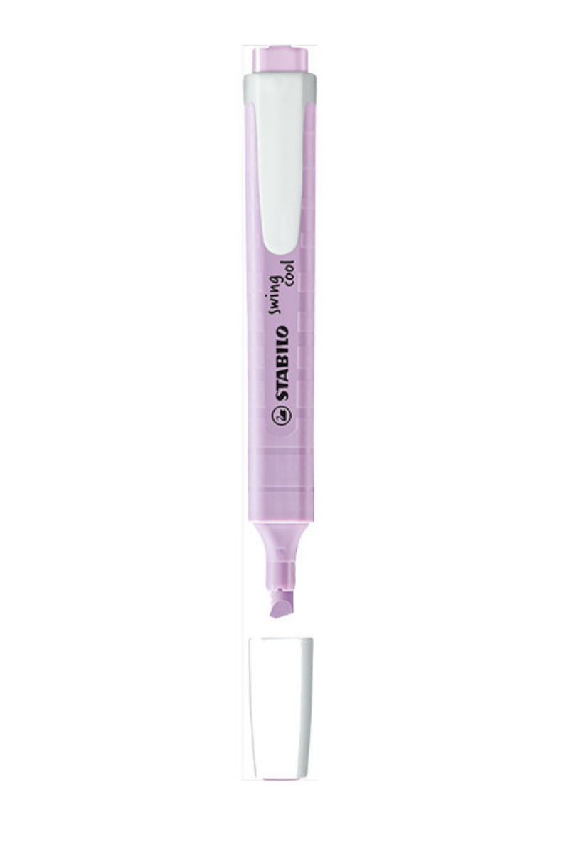 Stabilo zakreślacz Swing Cool Pastel fioletowy Cechy produktu: Technologia STABILO Anti-Dry-Out: aż do 4 godzin bez skuwki dla maksymalnie wydajnej pracy Praktyczny klips dla tych, którzy są zawsze w ruchu Antypoślizgowy, matowy uchwyt Kolor: fioletowy 2 grubości linii: 1 mm i 4 mm - gruba kreska jest idealna do szybkiego zakreślania całych bloków tekstu, wąska - do podkreślania pojedynczych słów Tusz na bazie wody EAN: 4006381518611